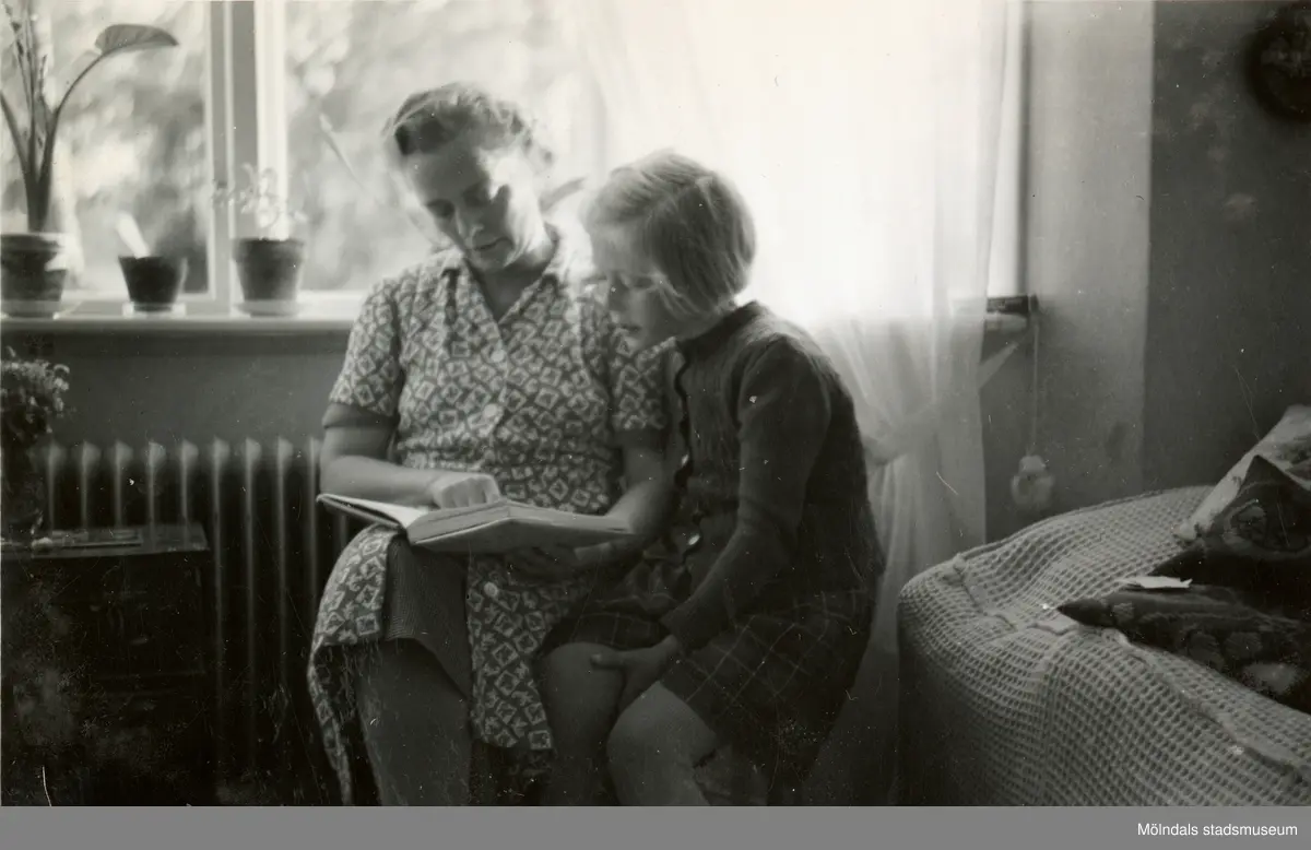 Rosa Pettersson hjälper dotter Eva (gift Kempe) att läsa läxan, Gamlehagsvägen 17 i Torrekulla, år 1952.
