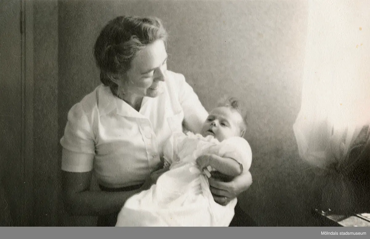 Karin Petterssons (gift Hansson) dopdag 1947-04-13. Modern Rosa Krantz (gift Pettersson) håller dottern i sin famn.