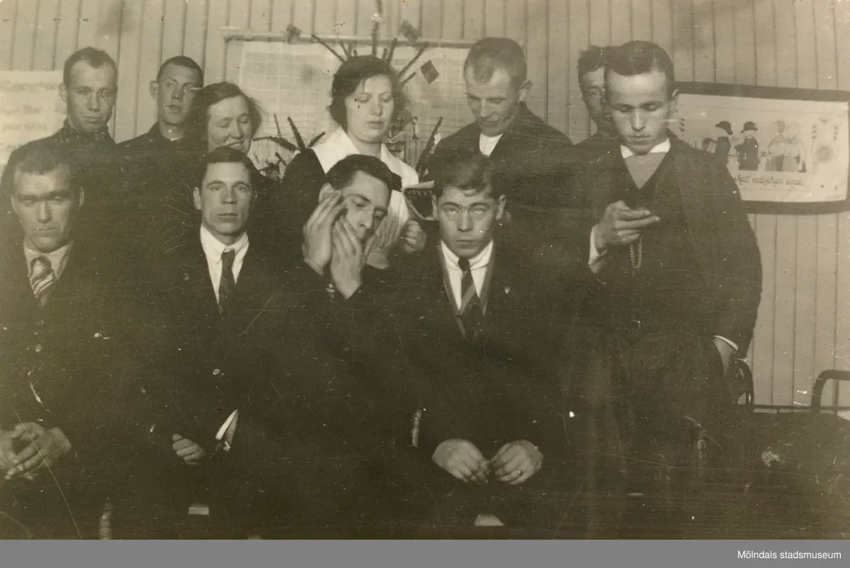 Julfirande på arbetshemmet för elever boende på Stretereds vårdhem år 1925. Nio män (elever) och två kvinnliga vårdarinnor står uppställda framför en julgran. Arbetshemmet låg nära personalbostäderna.