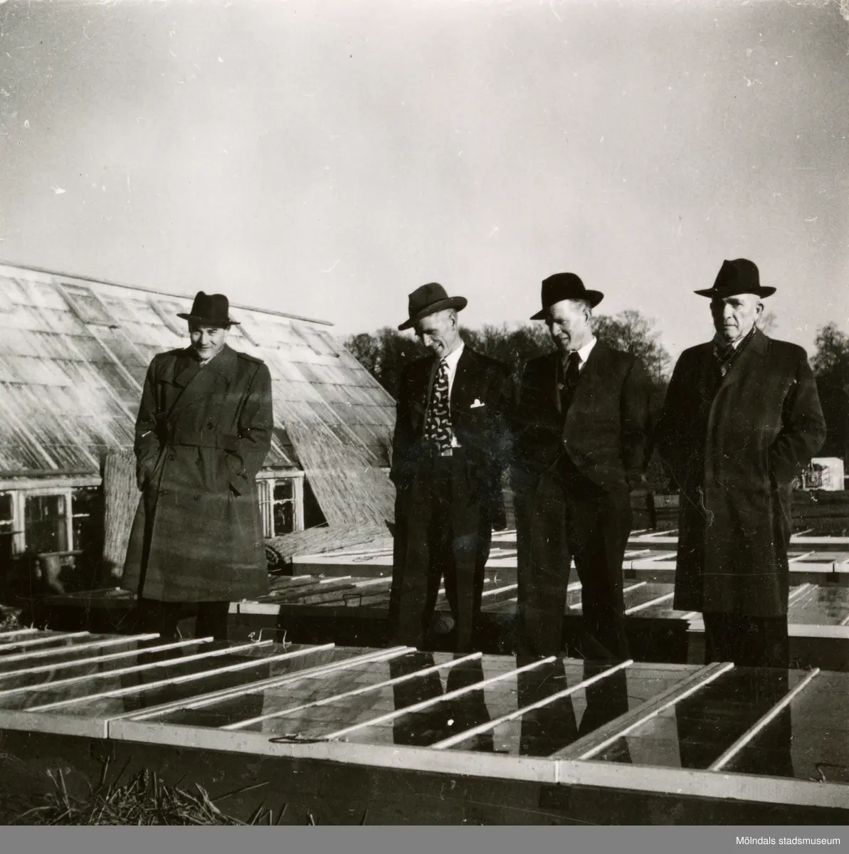 Fyra män står tillsammans vid Stretereds drivbänkar/växthus, 1940-tal. Längst till höger ses skomakare Carl Krantz (1880 - 1956) som arbetade som skomakar-lärare vid Stretereds vårdhem. En av männen är trädgårdsmästare Lundberg.