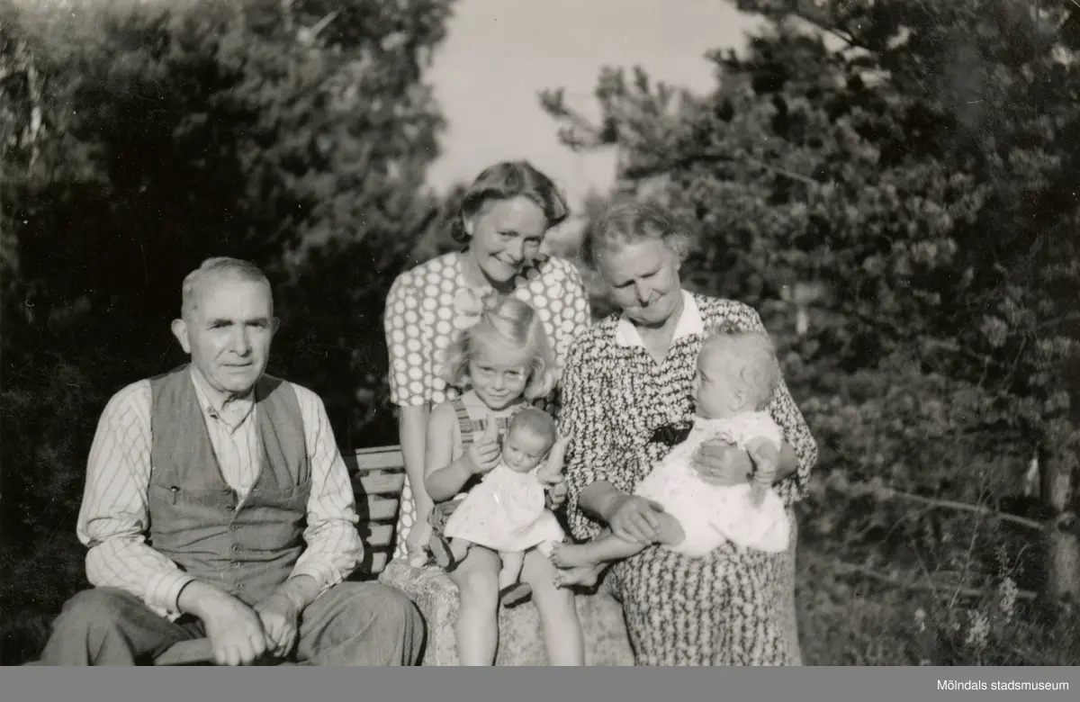 På besök hos mormor och morfar i Stretered år 1947. Från vänster: Carl Krantz (1880 - 1956), dottern Rosa Pettersson (1912 - 1994) med sin dotter Eva (född 1944, gift Kempe) i knäet och mormor Nora Krantz med barnbarnet Karin (född 1947, gift Hansson) i knät.