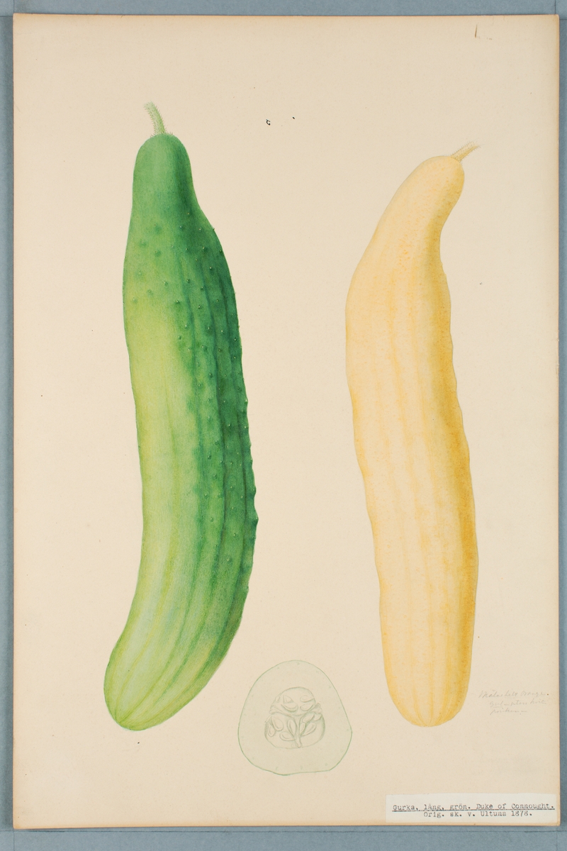 Sveriges kulturväxter. Illustration utförd av Henriette Sjöberg. Gurka, lång, Duke of Connought. Odlad Ultuna 1878. Inv. nr. C101 : 496.