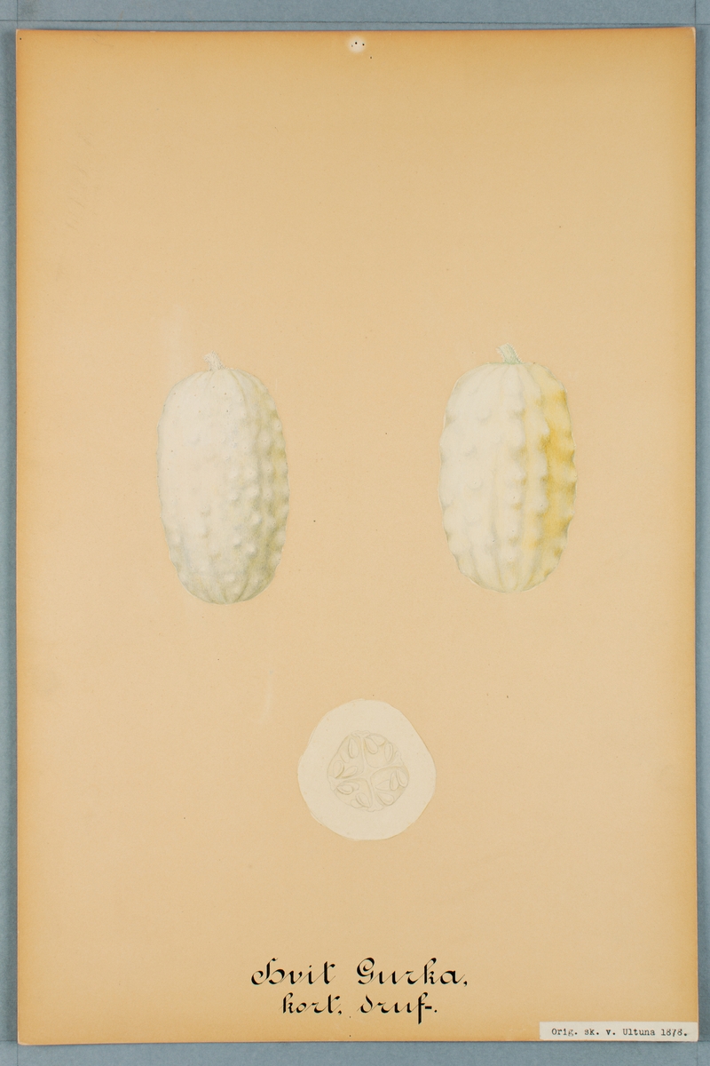 Sveriges kulturväxter. Illustration utförd av Henriette Sjöberg. Gurka, kort, vit, Druvgurka, småknottrig. Odlad Ultuna 1878. Inv. nr. C101 : 503.
