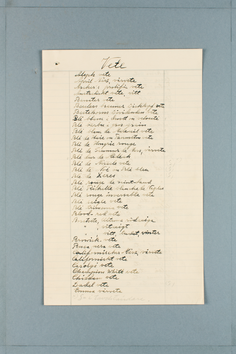 Sveriges kulturväxter. Lista över olika sorters vete med anknytning till illustrationer utförda av Henriette Sjöberg.