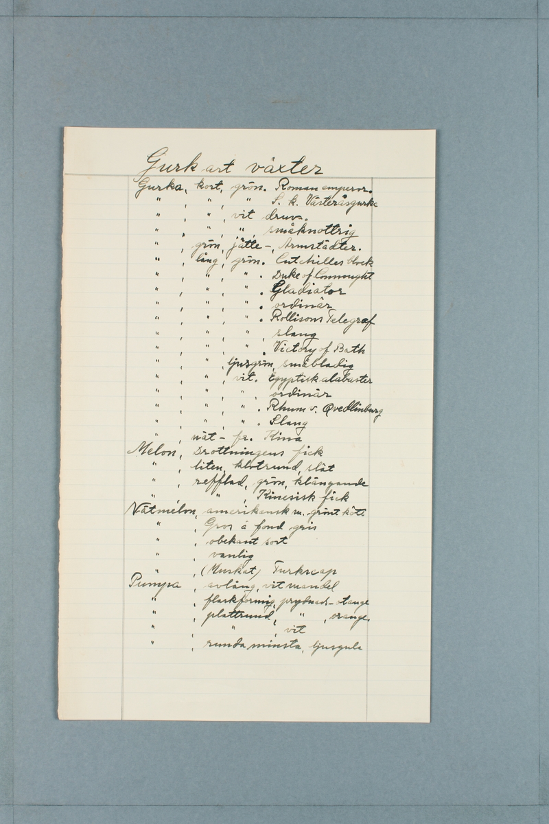 Sveriges kulturväxter. Lista över olika gurkväxter med anknytning till illustrationer utförda av Henriette Sjöberg.