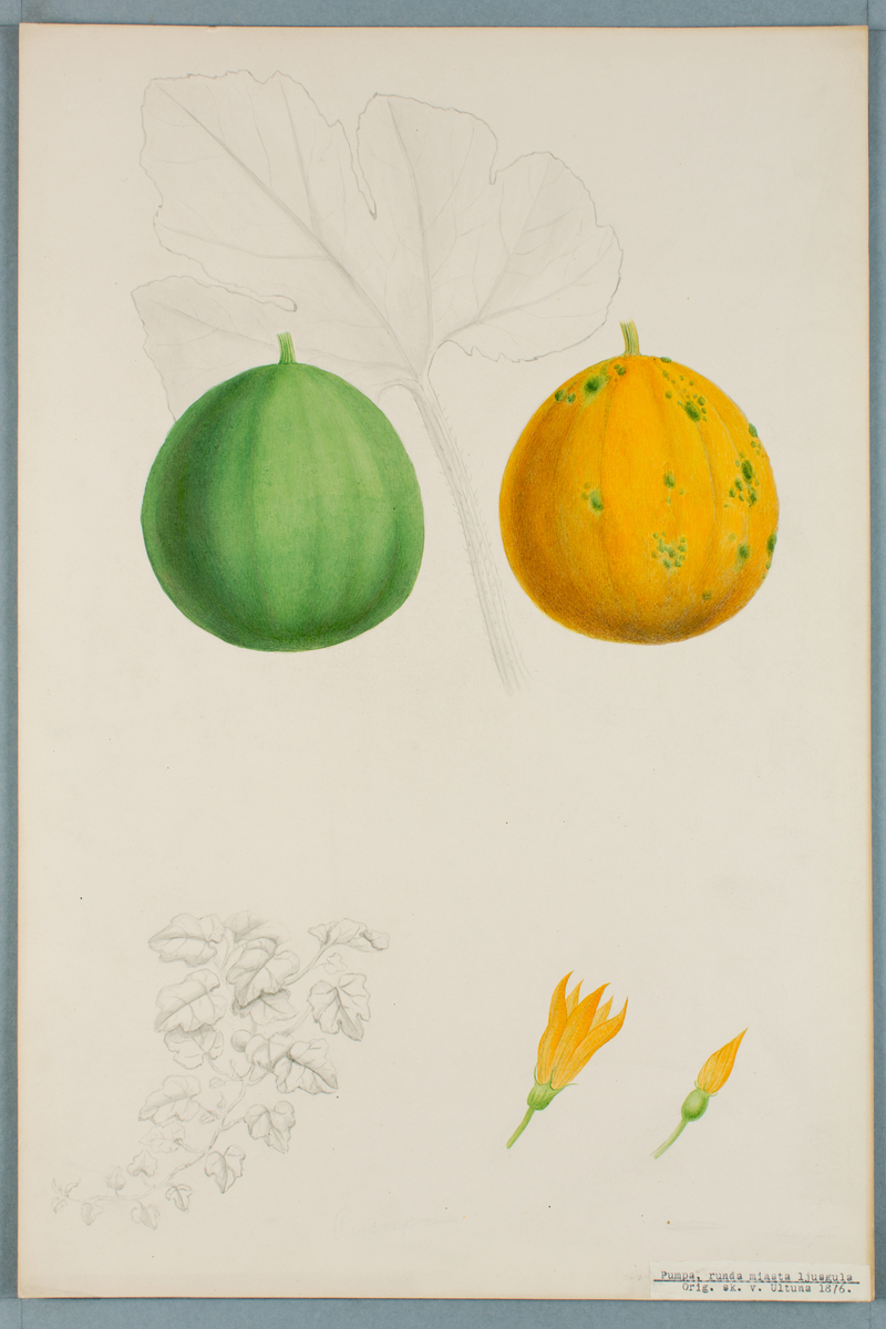 Sveriges kulturväxter. Illustration utförd av Henriette Sjöberg. Pumpa, runda, minsta, ljusgula. Odlad Ultuna 1876. Inv. nr. C101 : 524.