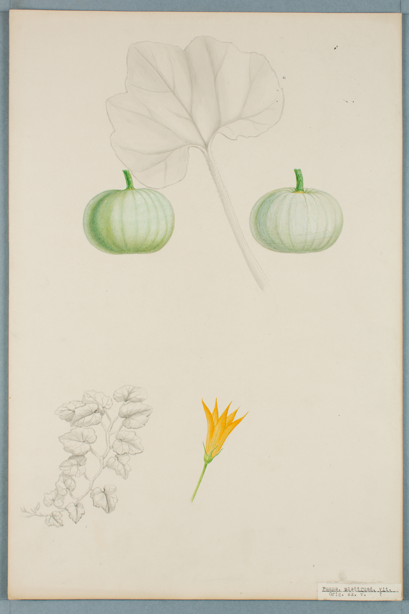 Sveriges kulturväxter. Illustration utförd av Henriette Sjöberg. Pumpa, plattrund, vit. Odlingsplats och datering saknas. Inv. nr. C101 : 525.
