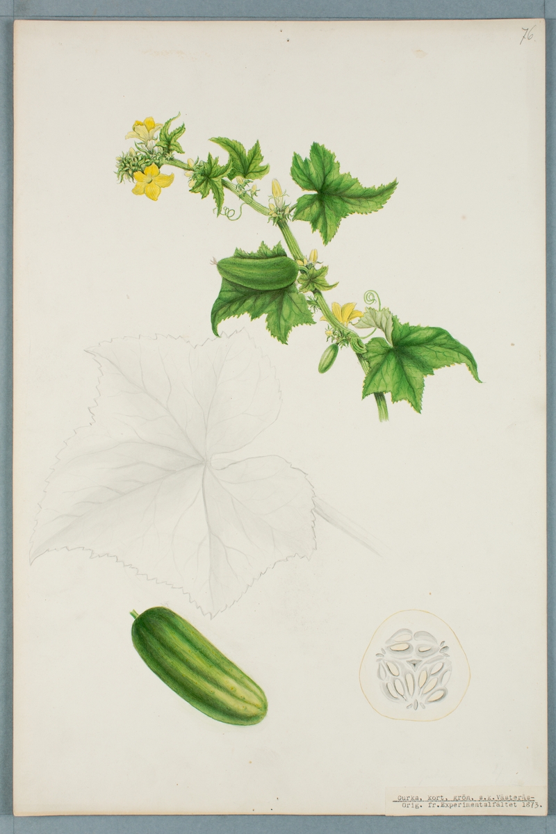 Sveriges kulturväxter. Illustration utförd av Henriette Sjöberg. Gurka, kort, så kallad Västeråsgurka. Odlad Experimentalfältet 1873. Inv. nr. C101 : 493.
