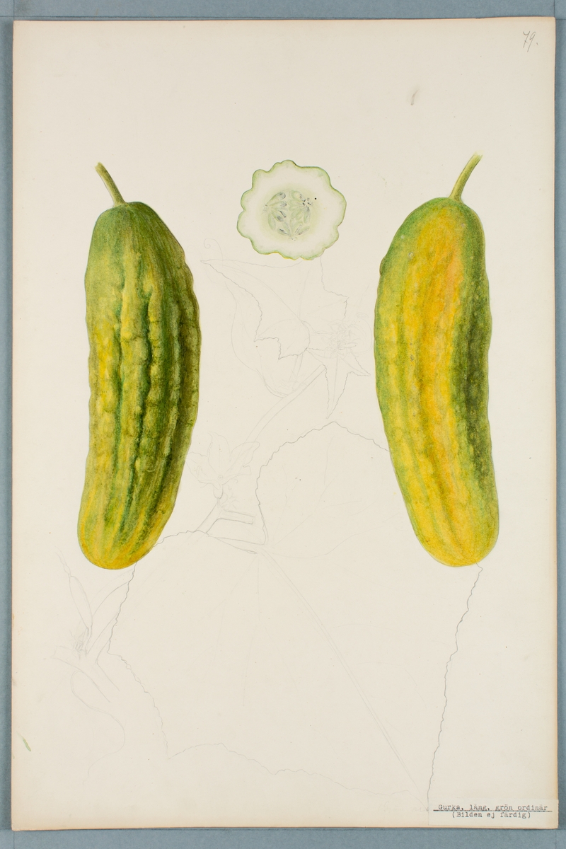 Sveriges kulturväxter. Illustration utförd av Henriette Sjöberg. Gurka, lång, ordinär. Odlingsplats och datering saknas. Inv. nr. C101 : 501. Bilden är ej färdig (påskrift på bilden).