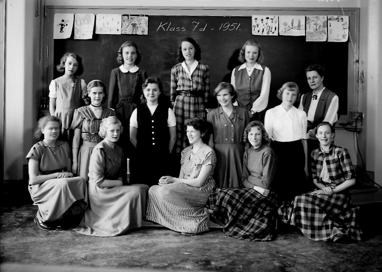 Engelbrektsskolan, klassrumsinteriör, 13 flickor med lärarinna fru Hertha Nessen.
