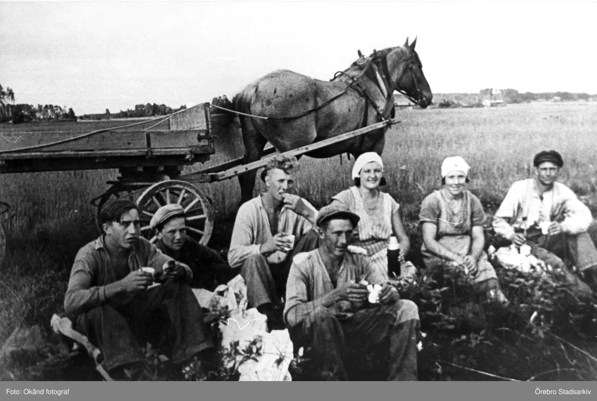 Kaffepaus i skördearbete på Anderssons gård i Förlunda, 1930-tal