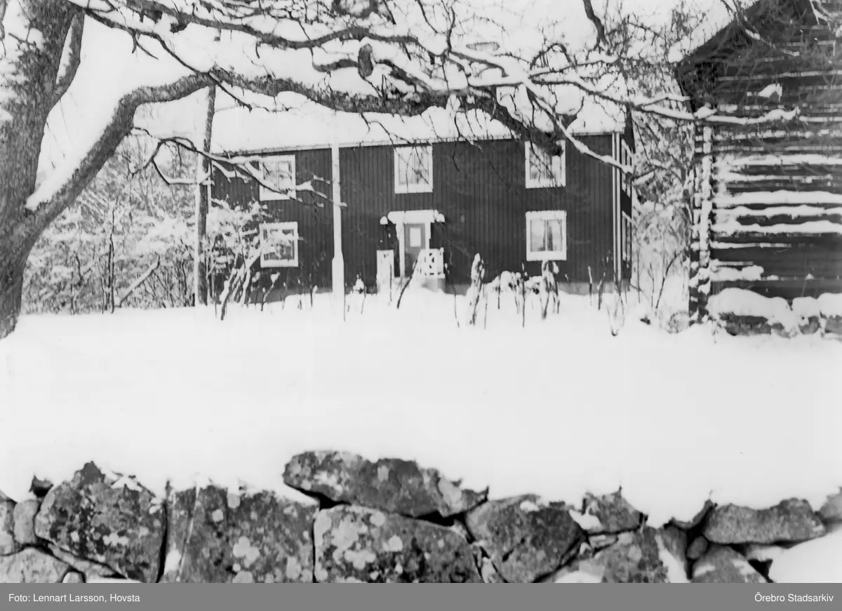 Stenmur framför huvudbyggnaden och korsvirkeslada på Gården Fjärndeln i Yxta i Hovsta, 1985