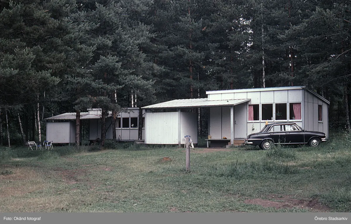 Bil framför två vita stugor i Skagerns stugby, 1968
