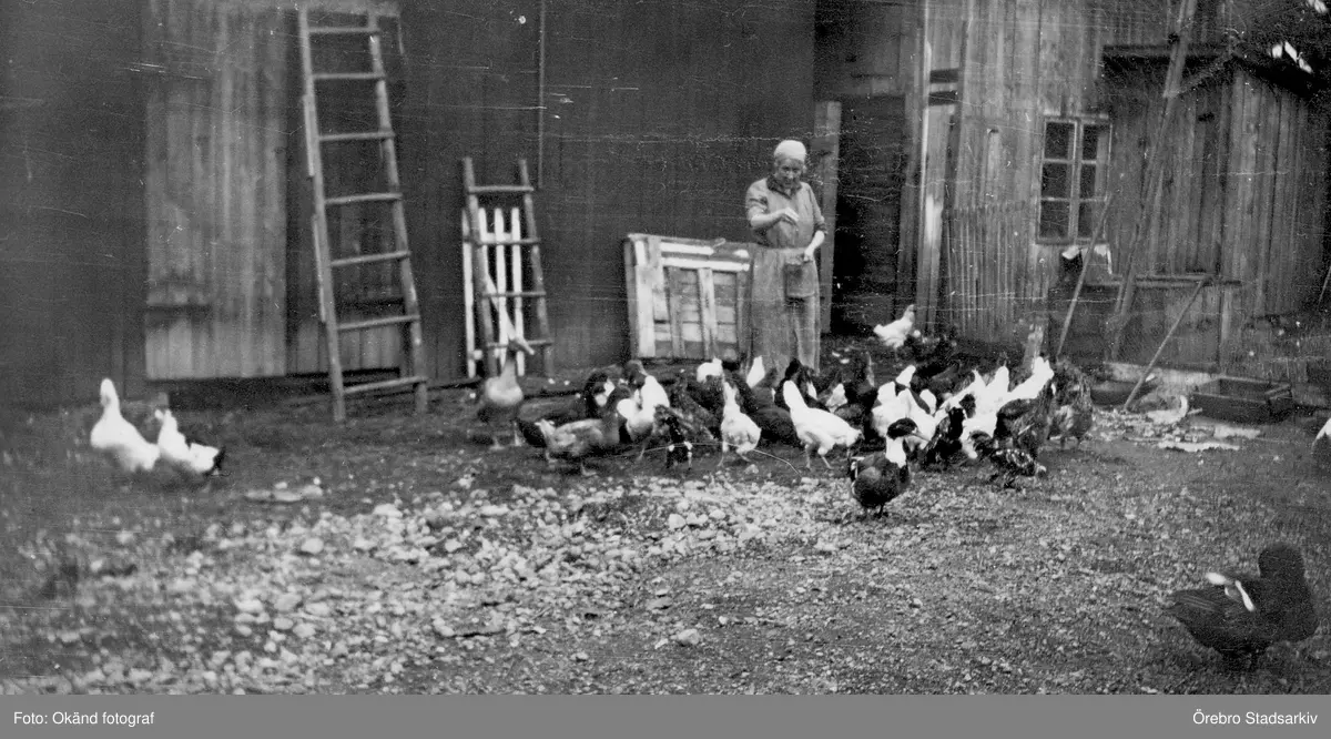 Gerda matar höns och ankor i Yxtabacken i Hovsta, 1920-tal