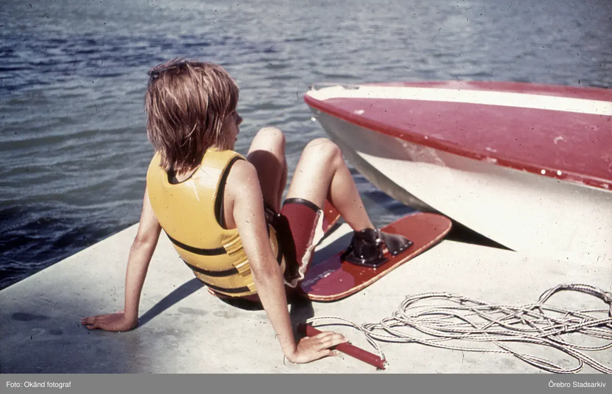 Pojke väntar på att få åka vattenskidor i Hjälmarbaden, 1960-tal