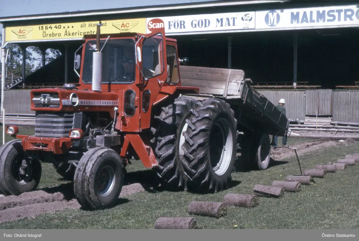 Traktor gräver bort gräsmatta på Eyravallen, 1990-tal