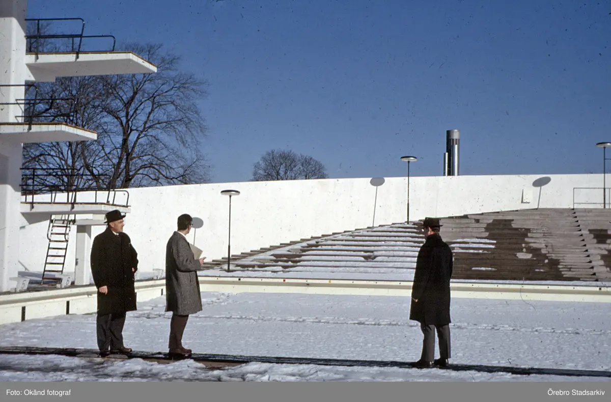 Snön täcker både simbassäng och hopptorn i Gustavsvik, 1970-tal