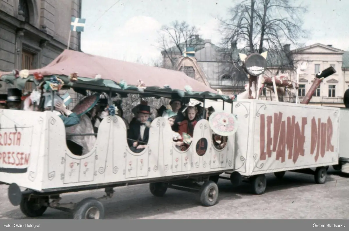 Vagn med levande djur och Rosta-expressen på Karrolinska skolans gård, 1956-1959