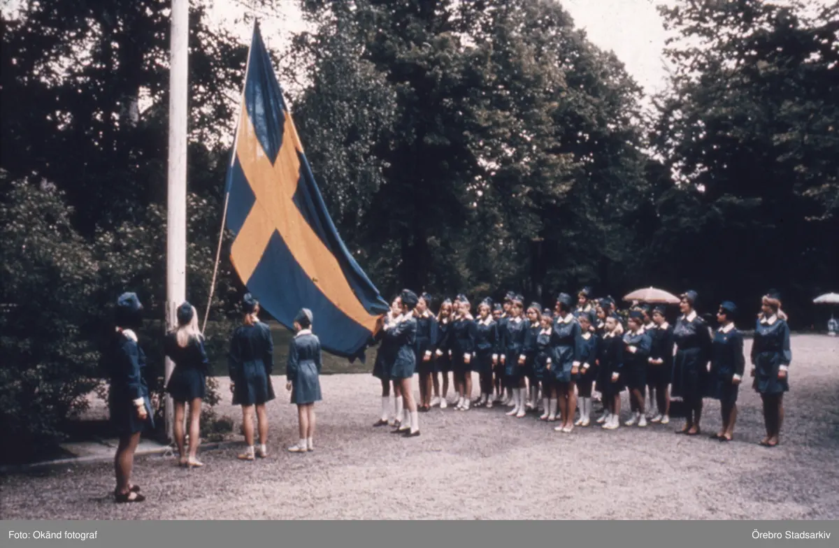 Deltagare i Röda korset hissar svenska flaggan, 1960-tal