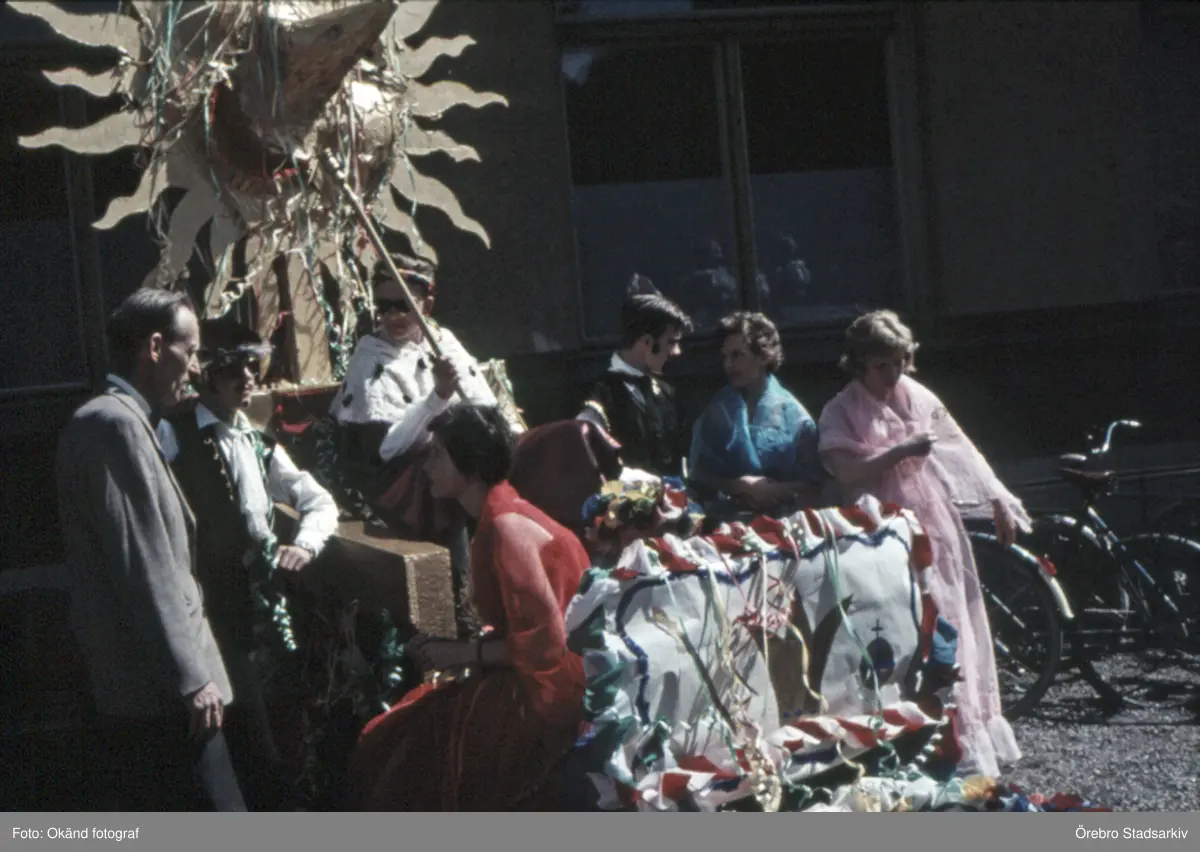 Välklädda personer runt Kung Sols vagn på Barnens dag, 1950-tal