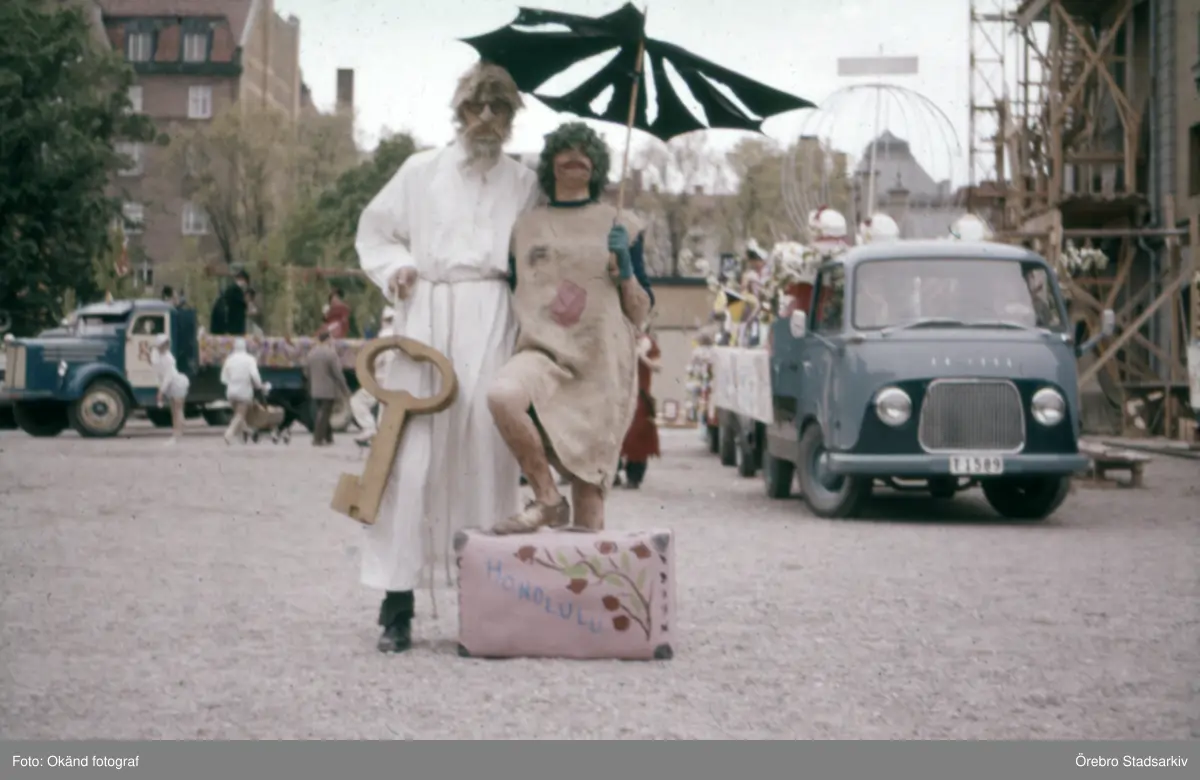 Poserande par med resväska framför lastbilar på Barnens dag, 1950-tal