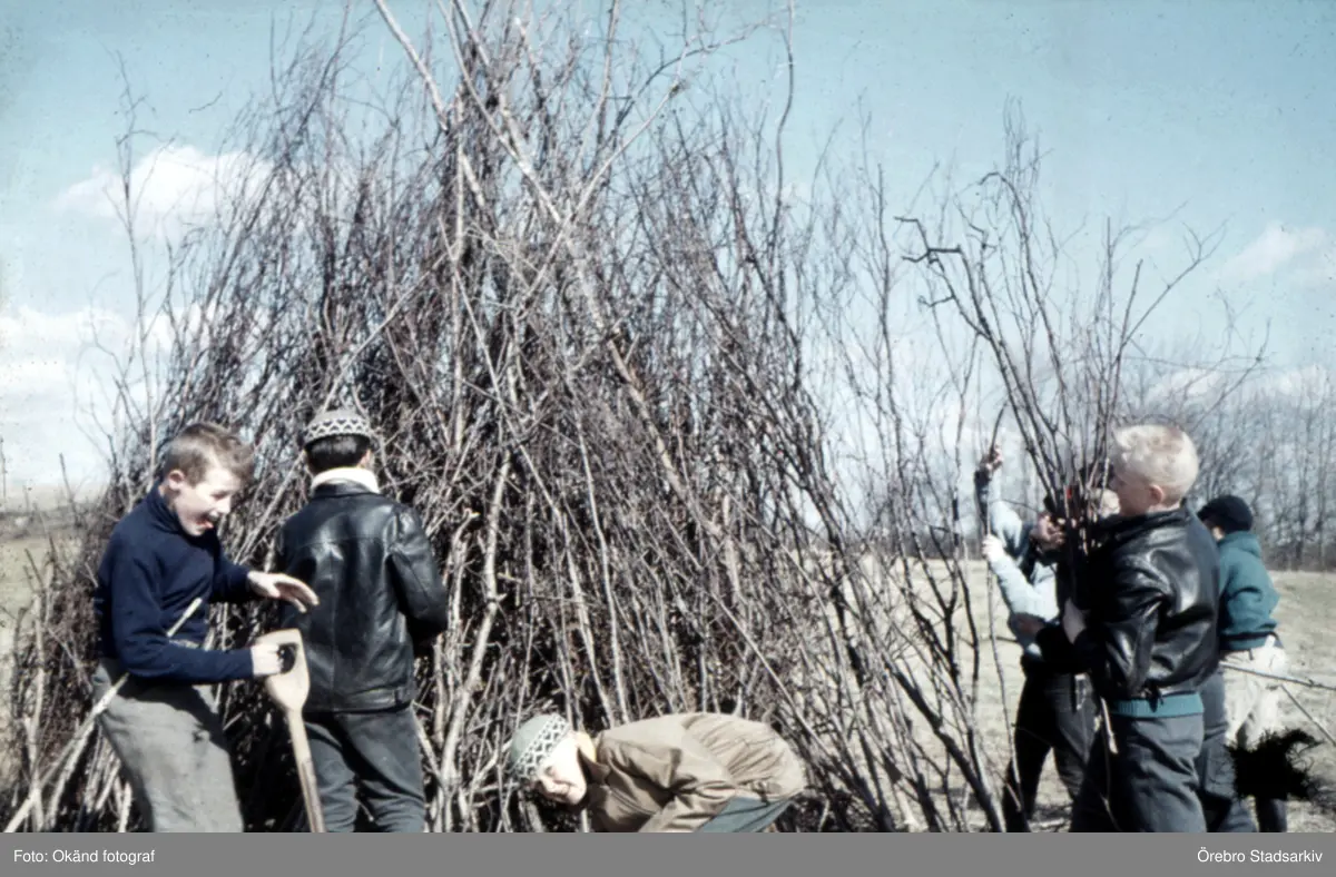 Pojkar samlar grenar till en majbrasa, 1970-tal