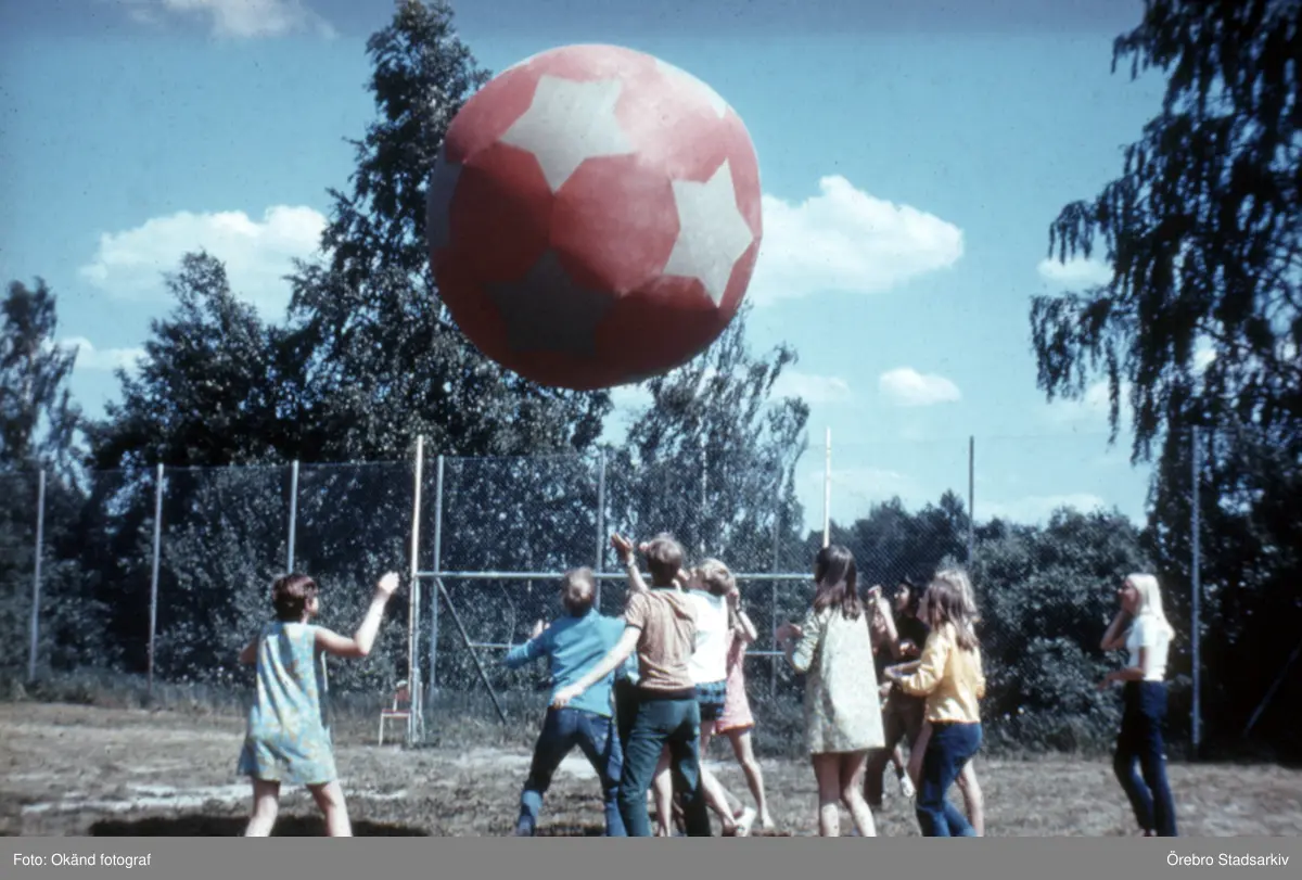 Ungdomar leker med boll på idrottsplan, 1970-tal