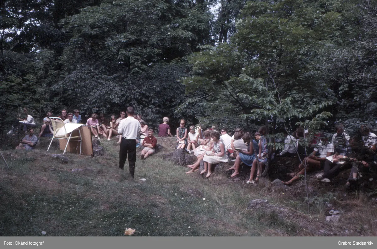 Samling i skogsbrynet vid scoutläger i Ånnaboda, 1960-tal
