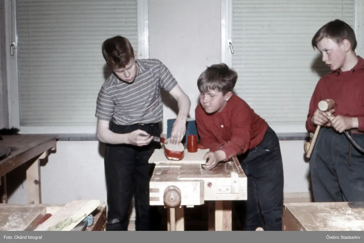 Tre pojkar vid snickarbänken på fritidsgården 1960-tal