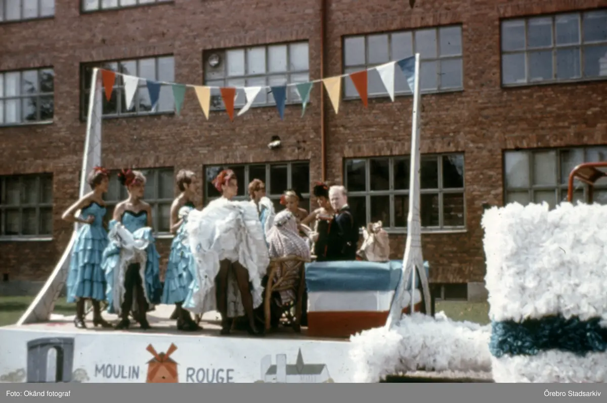 Flickorna från Moulin Rouge ska strax börja dansa i Barnens dag-tåget, 1950-tal