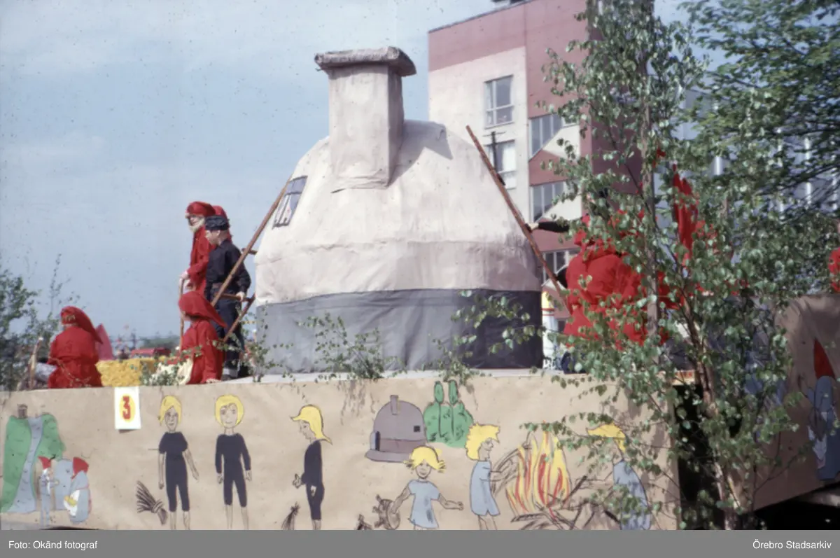 Sotare och röda gubbar vid Hattstugan på barnens dag-tåg, 1950-tal
