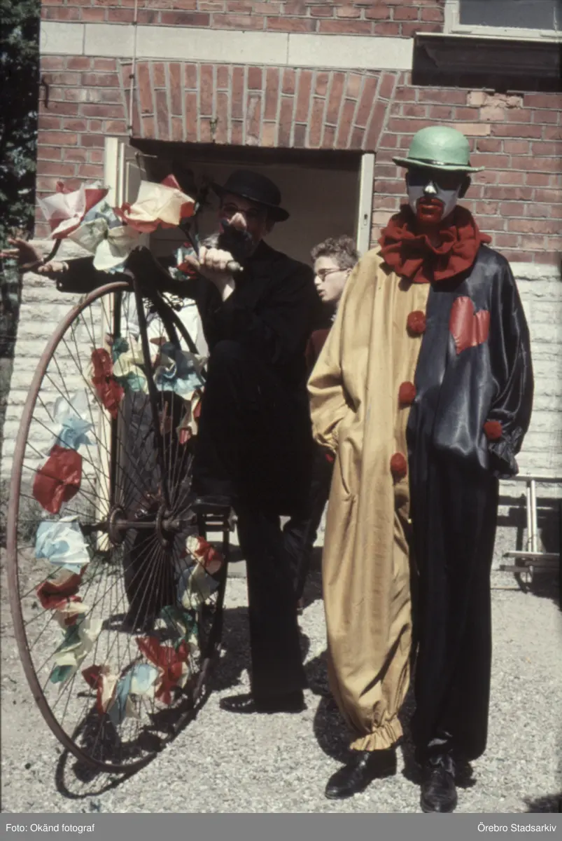Clowner med höghjuling i väntan på Barnens dag-tåget, 1950-tal