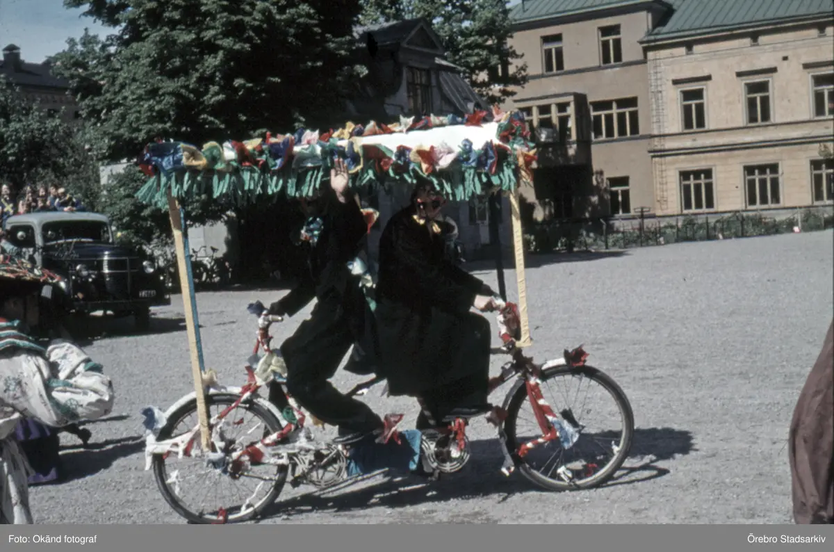 Clowner på tandemcykel med dubbelt styre i Barnens dag-tåget, 1950-tal