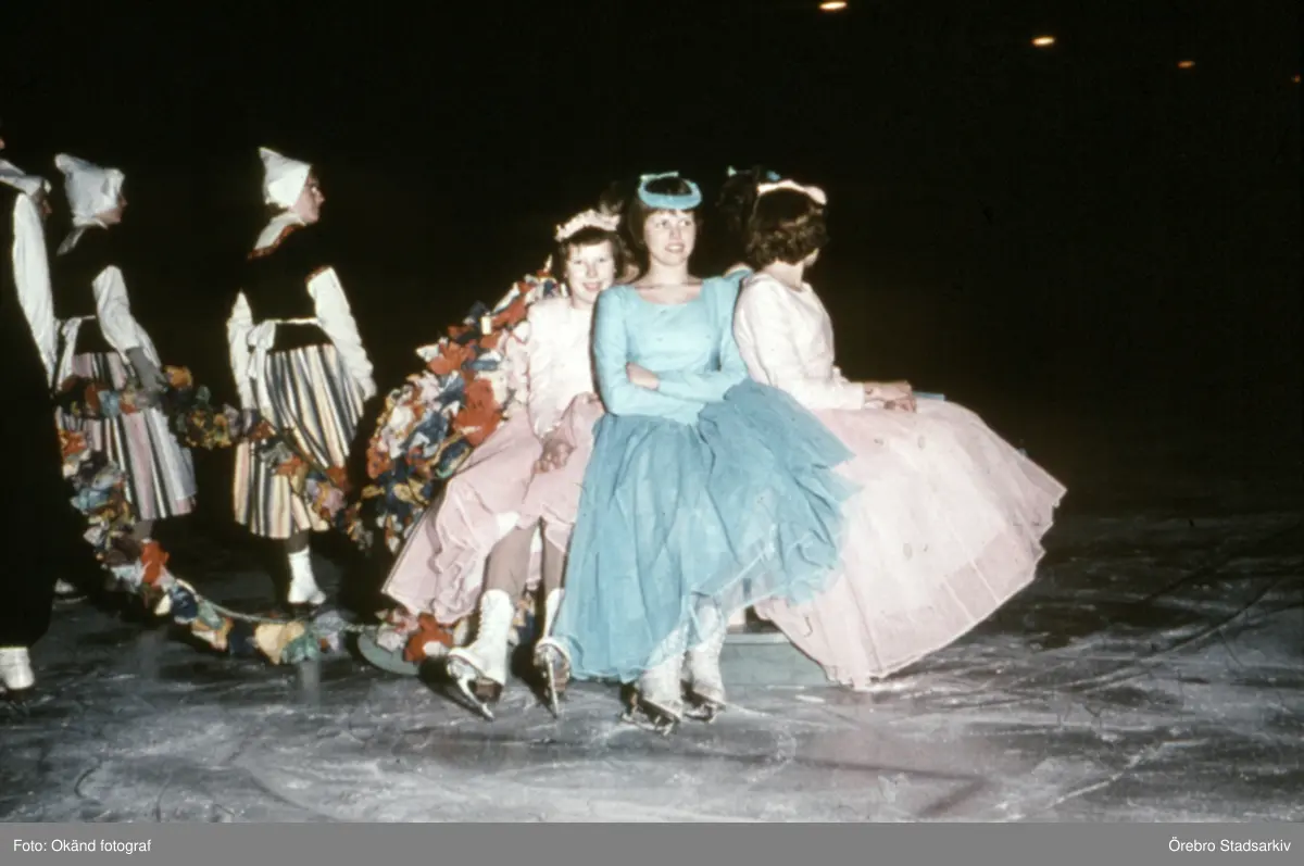 Ungdomar utklädda till holländare och sagofeer på skridskor, 1950-tal