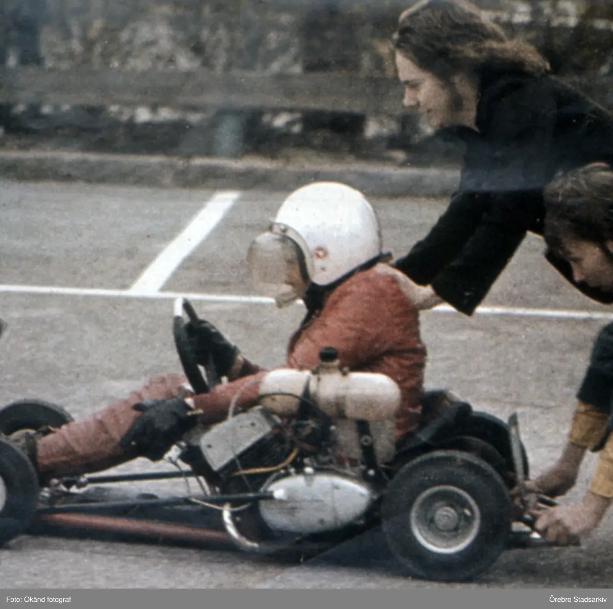 Pojke åker gokart på bana i Täby, 1970-tal