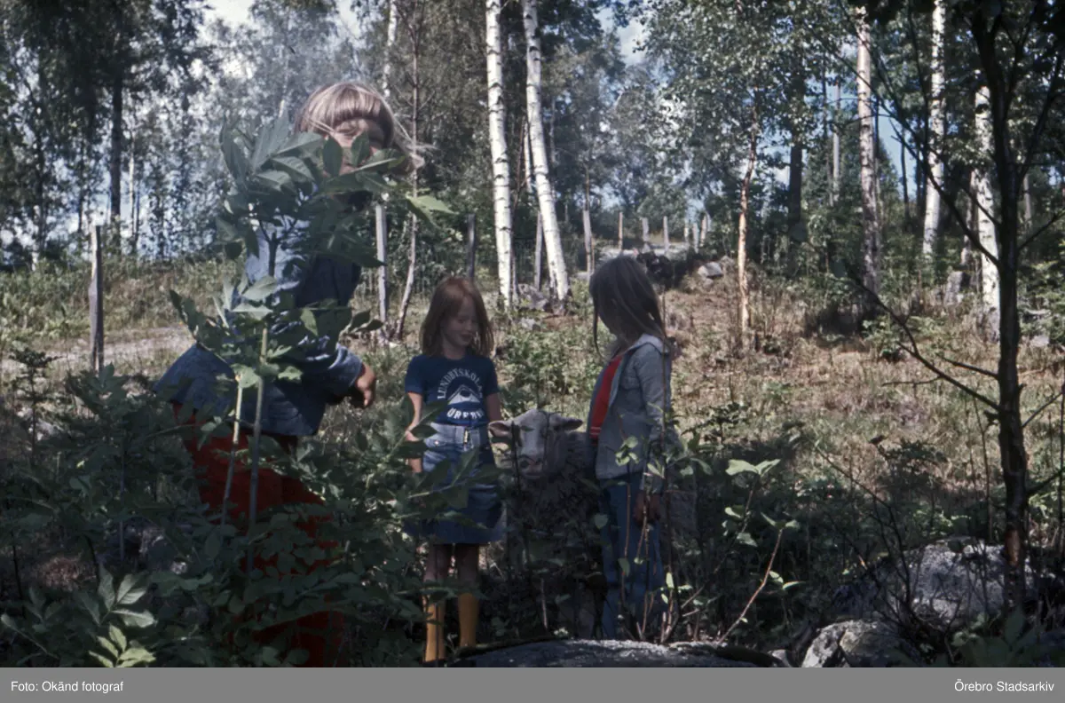 Elever från Lundbyskolan möter ett får i skogen, 1970-tal