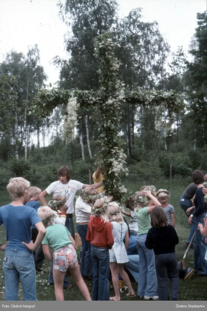 Ledare och ungdomar med rest midsommarstång, 1970-tal