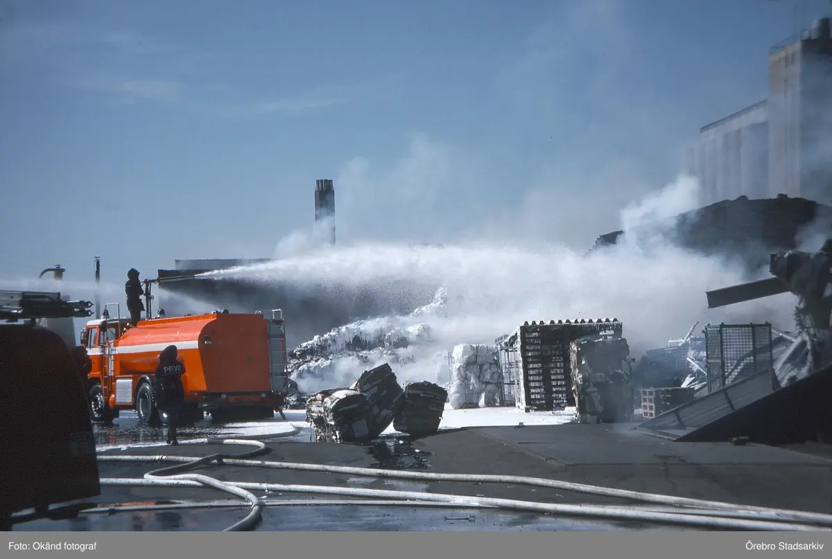 Brandkåren sprutar skum vid branden vid Gotthards, april 1982