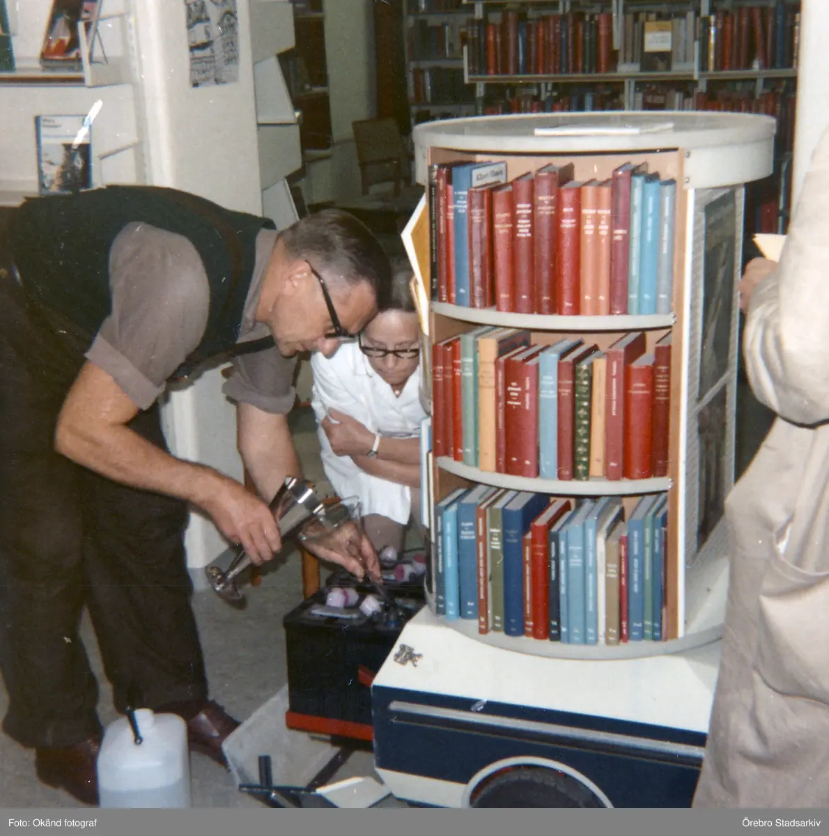 Elektriker inspekterar bokvagnens batterier på Regionsjukhuset, 1968-07-17