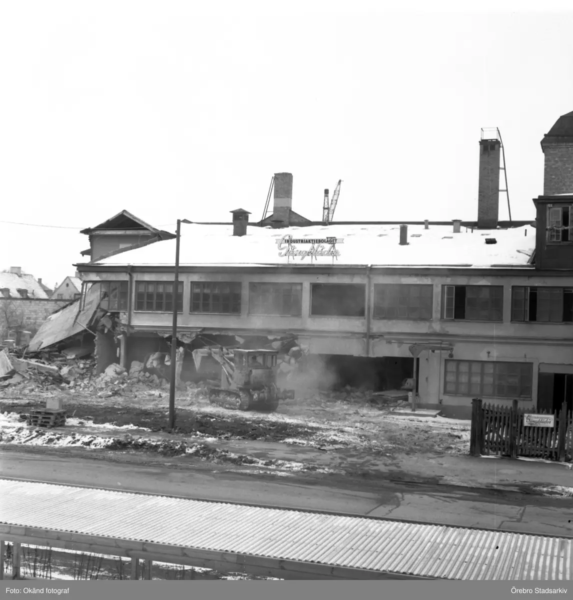Grävmaskin arbeter med rivning i kvarteret Smeden, 1970-tal