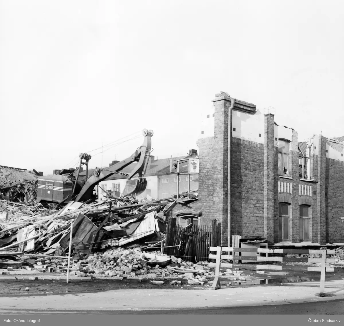 Grävmaskinen närmar sig den sista väggen på Idrottsvägen 14, 1970-tal