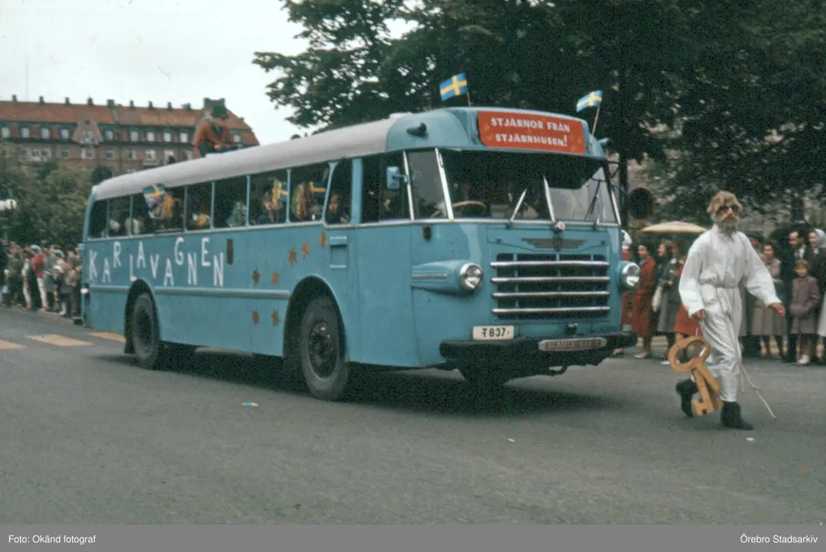 Bussen Karlavagnen kör längst Storgatan på Barnens dag, 1950-tal