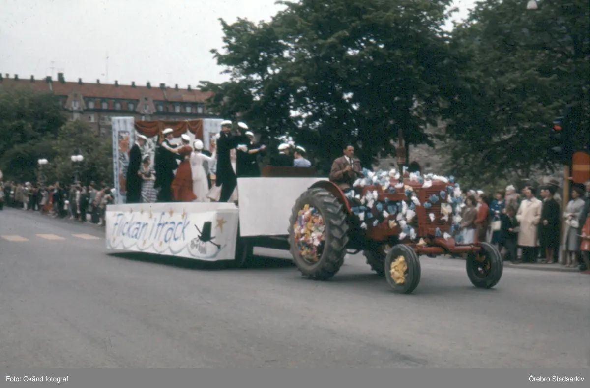 Dansande par blir dragna av traktor i Barnens dag-tåget, 1950-tal