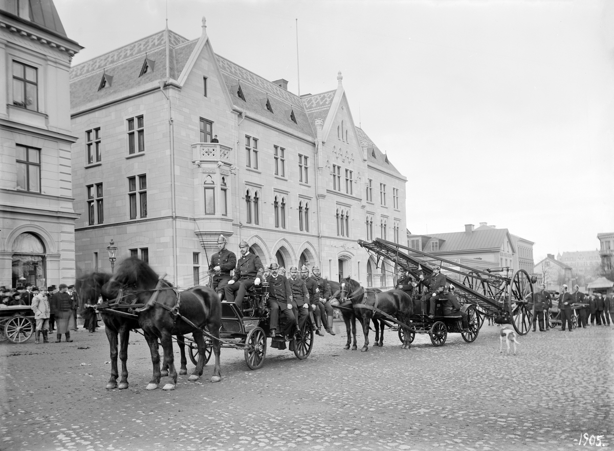 Linköpings brandkår samlad på S:t Larstorget inför uppvisning av sina färdigheter i brandbekämpning. Andra bilder i en serie låter oss veta att man valt Östgötabankens fastighet som övningsobjekt. I bilden skymtar gaveln till vänster. Väl synlig är dock det vid tiden nya riksbankshuset i fonden.