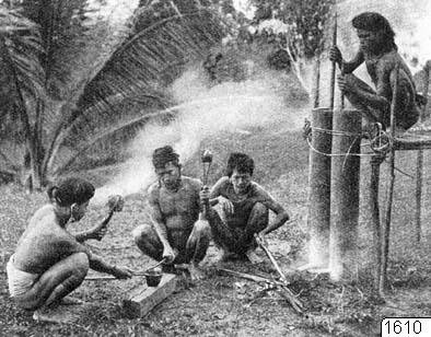 Smide. Hammaren är stenhammare. Efter Ch. Hose o W. McDougall: The Papan Tribes of Borneo. Georg Buschan: Illustrierte Völkerkunde. II:I. Stuttgart 1923. Abb. 538, p. 866.