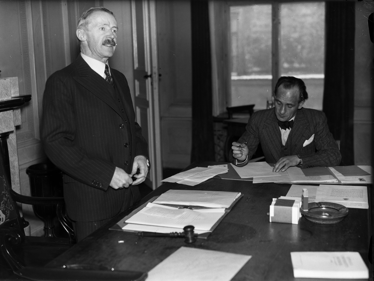 "Försvarslånekampanjen i Upsala län inledd", landshövding Sigfrid Linnér och ombudsman Einar Eriksson på Uplands nation, Uppsala 1942