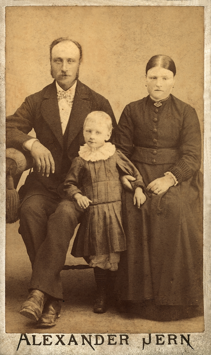 Ateljébild med en liten familj på tre personer, pappa, dotter och mamma.