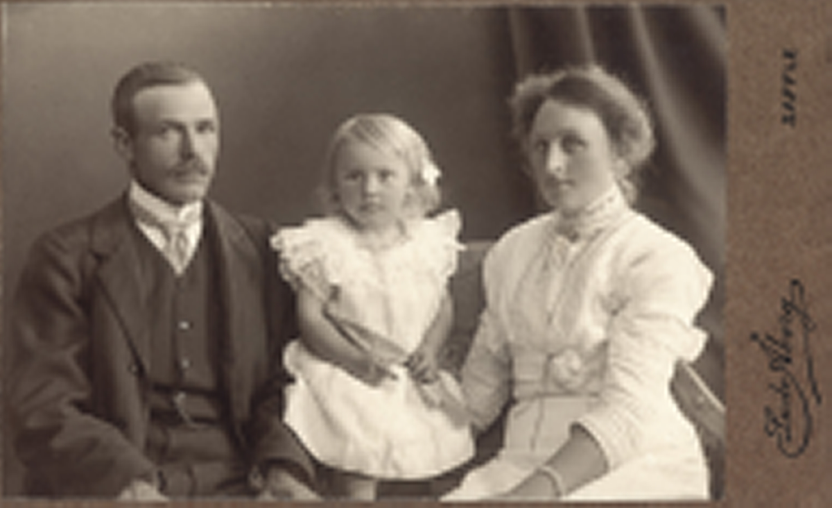 Ateljébild meden liten familj på tre personer, pappa, dotter och mamma.