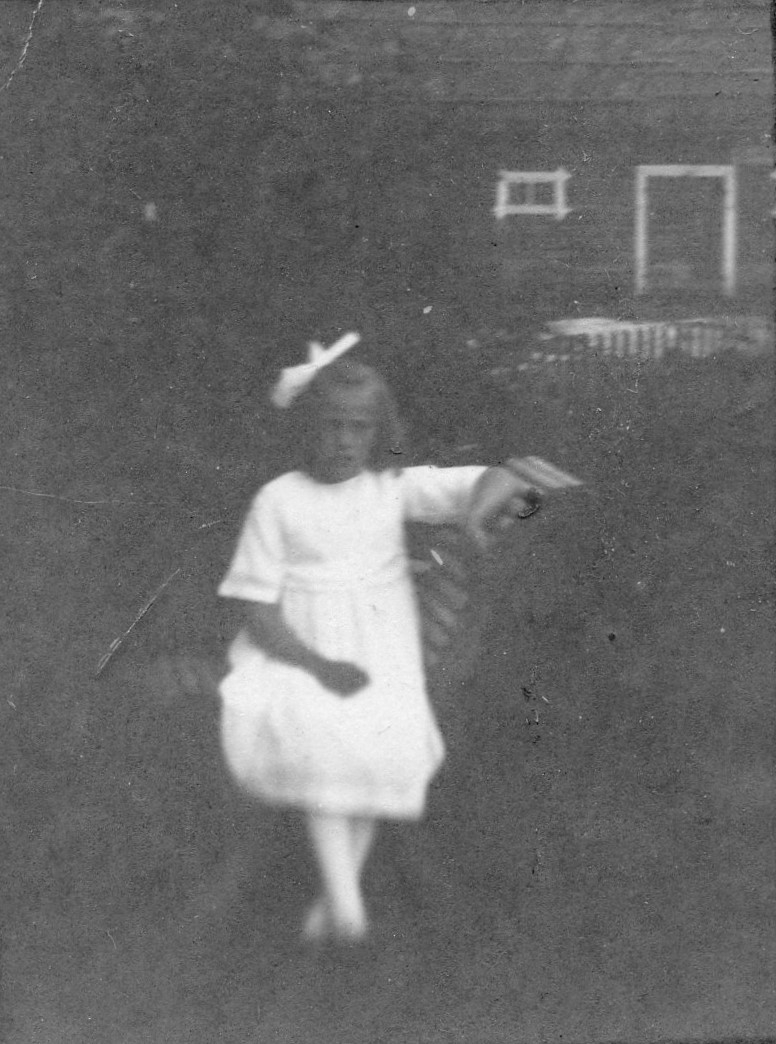 Porträttbild på flickan Elvy Nylén, sittande utomhus i en trädgårdsstol. I bakgrunden syns ett staket och stall eller ladugårdsbyggnad på andra sidan vägen.