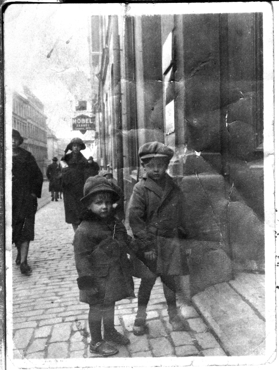Två små barn i stadsmiljö